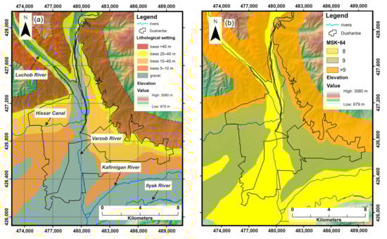 (a) River system and lithology in the area of Dushanbe (after [28]) and (b) seismic microzonation of Dushanbe by [29] based on the acoustic stiffness of the soils in terms of the MSK-64 scale.