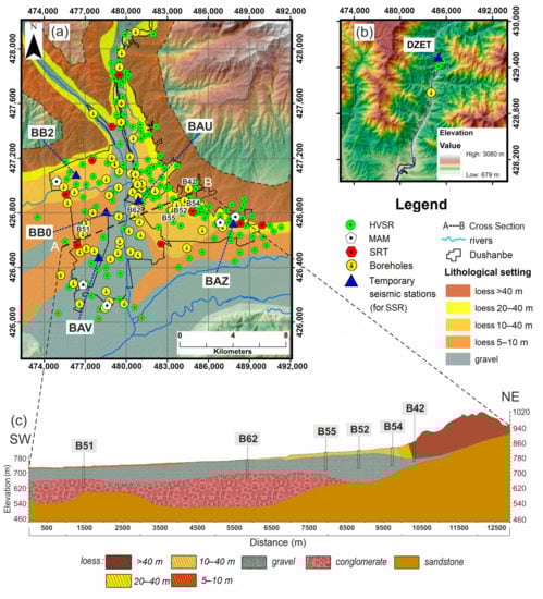 Locations of 60 boreholes, 5 microtremor array measurements (MAM), 9 seismic refraction tomography (SRT) profiles, 5 temporary seismic stations for standard spectral ratio (SSR) measurements, and 175 mobile seismic stations for horizontal to vertical spectral ratio (HVSR) measurements (a). The permanent seismic station Djerino (DZET, located in (b) serves as reference and is installed on a granite bedrock outcrop some 14 km north of Dushanbe (maps with hill shade and colored shuttle radar topography mission digital elevation model, SRTM DEM, of 30 m resolution as the background). Lithological cross section cutting through Dushanbe from southwest to northeast along profiles sketched from available boreholes (c); after the Head Institute of Engineering and Technical Surveys of the State Construction Committee of Tajikistan [27,29]. The numbers in the cross section (c) indicate examples of borehole logs (Section 4.1).