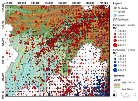 Epicenters of shallow (focal depths ≤ 45 km; marked in red) and deep (focal depths ≥ 70 km; marked in blue) earthquakes from the Central Asia Seismic Risk Initiative, Earthquake Modeling for Central Asia Catalogue (CASRI-EMCA; [34,35]) over the period from 850 until 2015, and updated from USGS catalogue (U.S. Geological Survey) over the period from 2015 until 2020.
