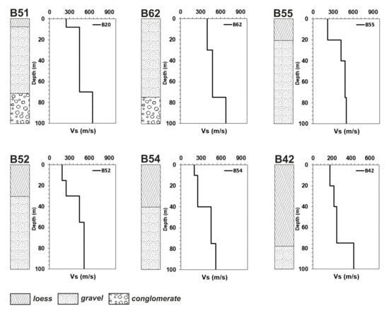 We compare the estimated lithological cross-section from southwest to northeast with existing borehole data (see Figure 3c). In the geotechnical map in Dushanbe [28], lithological profiles’ cross-sections were included (see Figure 3a). Based on the map, the cross-section A–B (Figure 3c) is compared with the use example at six sites information of the borehole data. Figure 5 compares the borehole data with inverted Vs profiles from downhole data of the previous studies by [29]. The depths of the borehole data and Vs profile are up to 100 m. Based on the borehole data, the soil in the south-west of the city is composed of thin layers of loess, gravel deposits, and conglomerate in the lower layers. In the center of the profile, according to the borehole data, the soil consists of gravel deposits, and conglomerates made of lime cement and rocks in the lower layers. In the north-eastern part, the total thickness of loess deposits within the study area varies, according to drilling and geophysical data, from 40 to 120 m at the junction of the foothill plain with a high terrace and to 160–200 m at the adyrs. Vs profiles, which correspond to gravel deposits, ranges from 380 to 550 m/s and for conglomerate from 600 to 750 m/s [29].