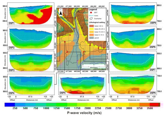 Additionally, on these profiles DSP5, DSP6, and DSP9, we could observe at larger depth a velocity of 2500 < Vp < 4000 m/s with a thickness between 5 and 10 m. This layer is most likely made of conglomerate rocks. On the other hand, in the northern part of the city, the DSP1 profile shows a relatively large skewed layer, marked 2500 < Vp < 4000 m/s, which approached the top layer of the SRT profile had a thickness between 10 and 35 m. According to the geology of the northern region, where the Varzob Mountain Range begins, this P-wave velocity of the DSP1 profile represents a sandstone layer (Figure 6).