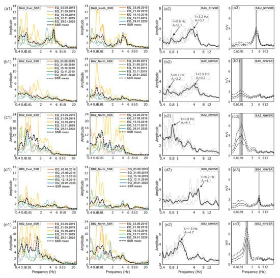 In order to calculate the SSR curves of the five preselected earthquakes, S-wave windows extracted and a Fourier amplitude spectrum (FAS) was calculated for each of the components. Only the north–south and east–west components were selected to estimate the SSR curve, and each of them was divided by the corresponding component from the reference station (DZET) calculated in a similar way. The resulting SSR curves are illustrated in Figure 11a1–e1. In addition, the squared mean (Havg) was calculated for all horizontal components of the station.