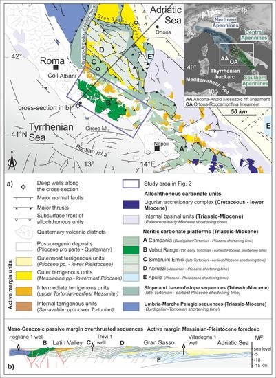 - Cosentino, D.; Cipollari, P.; Pipponzi, G. Il sistema orogenico dell’Appennino centrale: Vincoli stratigrafici e cronologia della migrazione. Evoluzione cinematica del sistema orogenico dell’Appennino centro-meridionale: Caratterizzazione stratigrafico-strutturale dei bacini sintettonici. In Studi Geologici Camerti - Convegno-escursione COFIN ’99; Numero Speciale; Cipollari, P., Cosentino, D., Eds.; Università degli Studi di Camerino: Camerino, Italy, 2003; pp. 85–99. [Google Scholar]