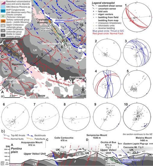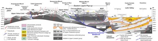 - Messinian to early Pliocene backthrusting (Thrust-4). New biostratigraphic data constrain the thrust top deposits in the Volsci Range and in the Latin Valley, where SE-directed backthrusts contributed to the tilt and cross-cut of previous Thrust-2 and -3 structures.