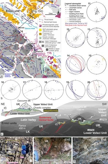 - Late Pliocene to Holocene normal faulting. Post-shortening extension has determined NE- and NW-striking orthogonal normal faults or WNW–ESE-trending right-lateral transtensional faults. These faults may have locally intercepted pre-existing normal faults that had been passively transported within the thrust sheets.