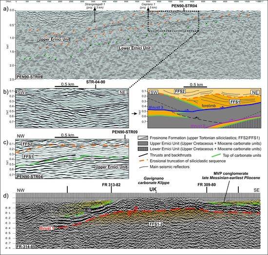 - Tortonian Chaotic complex emplacement (Thrust-1) and foreland-directed (in-sequence) thrust propagation (Thrust-2). During the overthrusting of the Upper Volsci Unit, Paleogene to Neogene basinal deposits were squeezed off towards the Foredeep and juxtaposed as a mélange unit on top of the carbonate platform together with early to middle Miocene calcareous-cherty-siliciclastics. The Chaotic complex also bears highly deformed basinal exotic and native blocks of neritic carbonates, the latter being scrapped off by the overthrust of the embedding Chaotic complex, whose Paleogene-Miocene matrix includes up to Tortonian nannoplankton. Seismic analysis supported by well logs at the regional scale highlighted repeated carbonate thrust sheets that have first been involved into an initial in-sequence propagation towards the foreland to the ENE occurred during foredeep to wedge-top sedimentation.