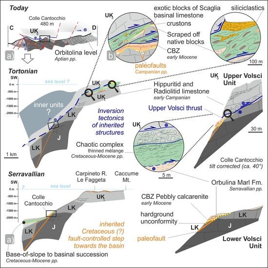- Late Cretaceous extensional tectonics. The dismembering of the carbonate platform into shallower and deeper domains is constrained by the finding of crustons that may testify moments of subaerial exposure, characterizing the top of the Lower Volsci UnItal. Cave exploration and field mapping allowed us to recognize a previously unreported fault-controlled paleo-escarpment constituted by Cretaceous and Jurassic carbonates sealed by early Miocene deposits that were previously dated as middle Miocene. These units seal a hardground settling on a platform edge facing to the west, where basinal to bypass slow-rate sedimentation occurred till Burdigalian time.