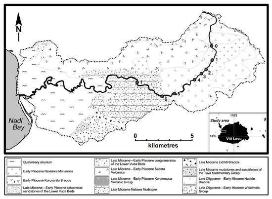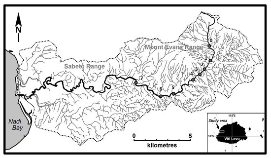 The Sabeto River drains the Sabeto and Mount Evans Ranges of western Viti Levu, Fiji (Figure 1). The river’s catchment is narrow and elongate. It is underlain by sedimentary, intrusive, volcanic and volcaniclastic rocks of Late Oligocene–Early Pliocene age [29,30,31] (Figure 2). The catchment extends over 137 km2 and reaches an altitude of 1195 m asl on its northeastern margin. The trunk stream is 34.8 km long. It rises at an elevation of just over 1000 m on the northern rim of the great amphitheatre within which lies the village of Navilawa. The river leaves the amphitheatre at its southwestern corner and flows west to reach the ocean at Nadi Bay. The river possesses few significant tributaries capable of introducing coarse sediment into the main channel. Above between 15 and 18 km downstream, the river flows in a relatively confined valley and the hillslope and channel systems are closely linked, although we have no information on the efficiency of sediment influx into the channel. Beyond that point, the valley widens and the presence of a floodplain means that the channel is decoupled from the surrounding hillsides.