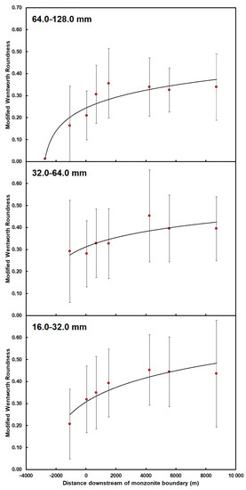 Thirdly, as demonstrated by Sternberg’s Law, particle size is (all other things being equal) a measure of the distance that a particle has been carried along the fluvial system [60]. Under these circumstances, a small particle is likely to be transported further and may experience greater abrasion than a large particle. It might be thought that this argument cannot apply in the case of the Sabeto, where all the particles studied are composed of rocks derived from the same outcrop and every gravel at a site would have travelled a similar distance downstream. But the monzonite outcrop extends for perhaps 3 km along the upstream channel (Figure 2). It is conceivable, therefore, that differences in the transport distance of clasts from the same sample could reach several kilometres, easily sufficient to account for the observed differences in particle rounding.