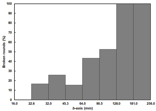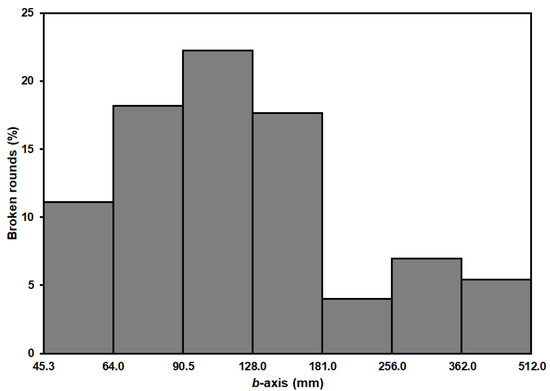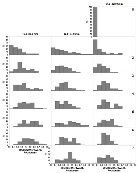 Gainsaying this is Bluck’s evidence of particle splitting on South Welsh beaches, particularly in the boulder grade (though his published results group together split and chipped gravels, making it difficult to calculate the proportions attributable to each process) [40]. Similarly, although she provided no measurements, Oak observed widespread and highly visible breakage on the boulder beaches of Australia’s New South Wales coast [53]. Our observations also reveal significant numbers of broken rounds (the products of particle splitting) at Lennox Head Beach in northern New South Wales, peaking in the 90.5–128.0 mm fraction (Figure 8). Breakage also appears to be common in fluvial environments. Apart from the data presented here, Malarz reported that 14–49% of clasts between 16.0 and 256.0 mm in diameter were broken during the 1997 and 2001 floods along the Soła and Skawa rivers in the Polish Carpathian Mountains [54], Lewin and Brewer noted that between 0 and 26% of 16.0–32.0 mm diameter pebbles on the beds of the Rivers Severn and Dyfi in Wales were broken [55], whilst Bretz found that broken rounds made up between 12.5 and <30% of the pebbles on active bars in the Snake River of Washington, USA [56]. We venture that breakage is so common amongst particles of cobble grade in fluvial environments that it alone may be sufficient to prevent particle assemblages from reaching roundness values approaching 1.0.