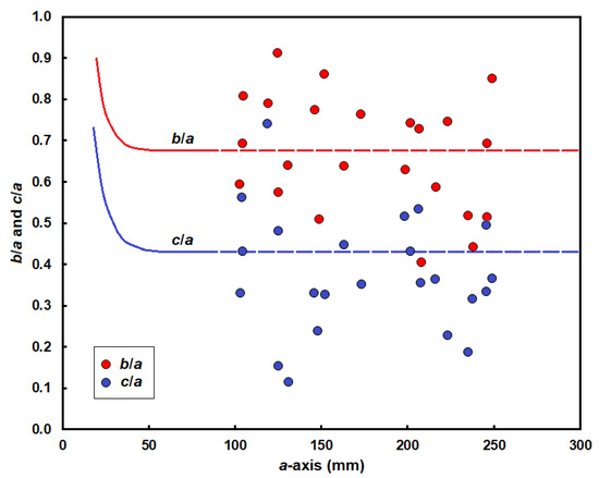 The b/a and c/a axis ratios of freshly weathered gravels of Navilawa Monzonite from the Sabeto River valley of western Viti Levu, Fiji as a function of particle a-axis length. The two sub-parallel lines represent the best-fit models of Domokos et al. [47], corresponding to the claimed shapes of particles generated by weathering, impact and explosion.