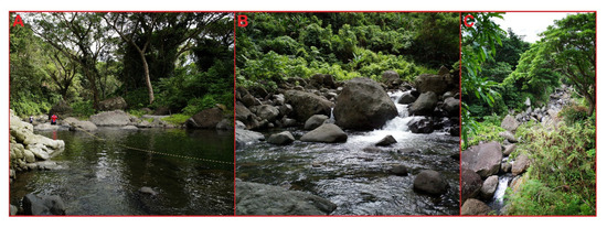 The Sabeto River of western Viti Levu, Fiji: (A) a low gradient, plane-bed reach 0.1 km upstream of Station 1, (B) the change from steep, headwater, step-pool conditions to gentle, downstream plane-bed conditions 0.2 km upstream of Station 1 and (C) the steep, cascade conditions characteristic of the river’s headwaters.