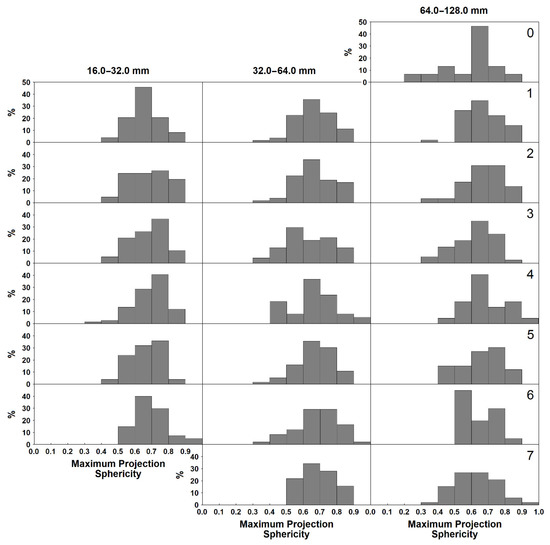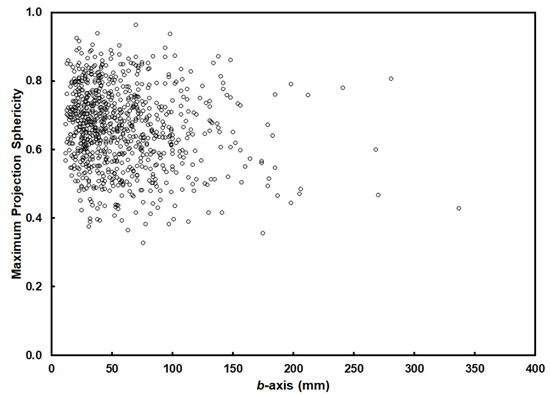 Our understanding of the role played by particle size in the sphericity of fluvial gravels has been frustrated by the reluctance of researchers to share the data upon which their speculations have been based. Sneed and Folk, for example, reported that ‘… measurement of a great many diverse pebble suites … has shown that, above about 8 mm., the sphericity commonly decreases as the pebbles get larger …’ [14]. Unfortunately, they provided no information to allow us to assess the strength of that relationship and how it might vary in different environments. Similarly, after measuring over 42,000 clasts, Ibbeken and Schleyer concluded that Ψp increases with grain size, although their measurements were confined to particles of 16.0–80.0 mm and brought together in a single data set measurements made on half a dozen or more different lithologies and on samples from a range of different environments [74]. More nuanced, though no less enigmatic, evidence includes that of (i) Allen, who reported that fluvial pebbles displayed a positive relationship between size and sphericity [75]; (ii) Sneed and Folk, who found that for fluvial pebbles of quartz and chert, larger particles were of significantly lower sphericity than smaller ones, although only within a relatively narrow size range of 30.0–70.0 mm [14]; (iii) Carroll, who found no relationship between the size and sphericity of fluvial pebbles of sandstone trapped in a pothole [76]; (iv) Plumley, who identified no consistent pattern of difference between the sphericity of the 16.0–32.0 and 32.0–64.0 mm fractions of fluvial gravels of limestone [49]; and (v) Dobkins and Folk, who found the Ψp of river clasts to be essentially invariate up to diameters of 128.0 mm [15]. Beyond that, sphericity is significantly lower, probably as a result of the spacing of breakage planes in the source rock.