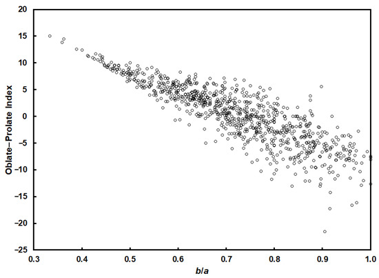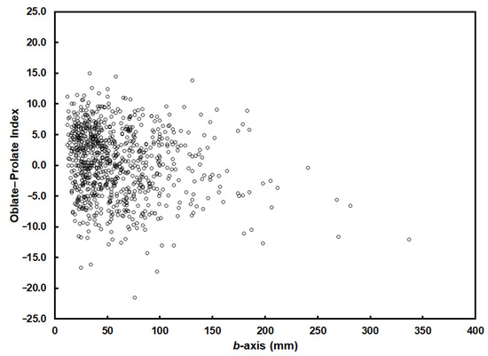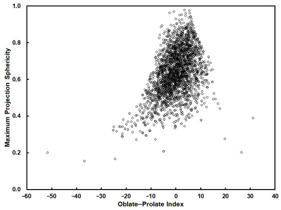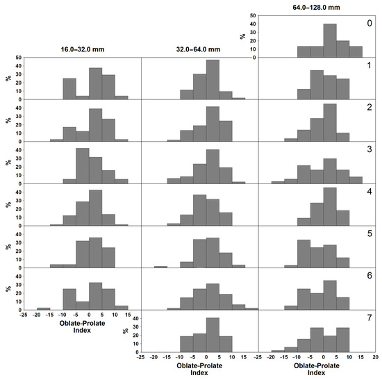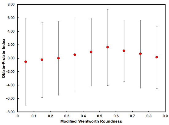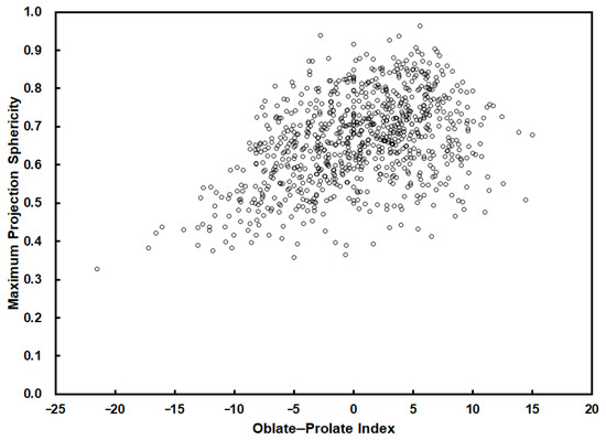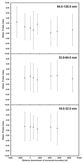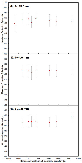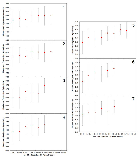 Similar results were obtained by Bradley et al., who recorded (for the isotropic rocks in their sample, at least) very small downstream increases in Ψp along the Knik River of southern Alaska [77], and by Glover, who noted downstream increases in sphericity along the fluvial terraces of the Santa Ynez basin in California, USA [78]. Finally, although they were unforthcoming about the source or shape of the 42,211 clasts they claimed to have measured, Ibbeken and Schleyer reported that the Ψp of gravels of 16.0–80.0 mm in the Calabrian region of southern Italy shifted from the low values of their jointed and weathered source rocks to the high values of their river-mouth sediments [74].