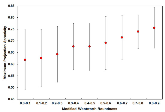- Sphericity: the measure of sphericity that appears best to reflect the hydraulic behaviour of particles is the Maximum Projection Sphericity (Ψp) [12,14,28]. This displays a close and direct relationship with the velocity at which a particle of a particular volume will settle in a fluid or roll on a bed. Maximum Projection Sphericity represents the ratio of the maximum projection area of a sphere of the same volume as the particle to the maximum projection area of the particle itself. Values of Ψp range from 0 to 1. A perfect sphere has a value of 1. The more discoidal a particle, the more Ψp tends to zero.
