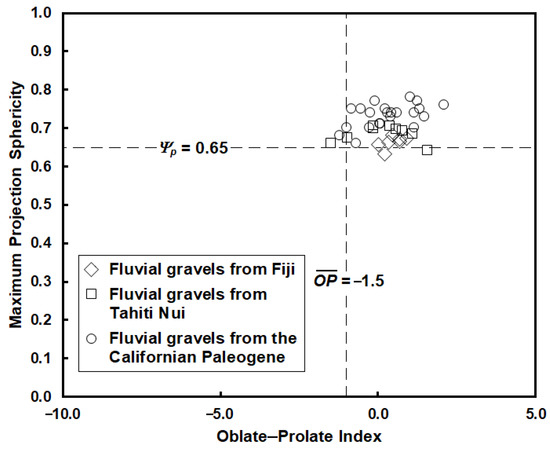 The 860 fluvial gravels measured in this study reveal no evidence of any variation in Ψp as a function of size, either at individual sites or throughout the entire data set (Figure 9). We might speculate that only the largest particles, whose entrainment is most marginal, would be subject to shape sorting as smaller particles would be entrained in all floods. This is in accord with the observation of Allen that more spherical (that is, more easily rolled) particles are more common in larger size fractions [75]. Nevertheless, there is no evidence from Figure 9 that the largest particles are of higher sphericity (and thus greater rollability). Alternatively, it is possible that entrainment along the Sabeto takes place under conditions of equal mobility. In these circumstances, mobility is effectively not size-dependent, and shape-sorting is presumably of relatively little consequence.
