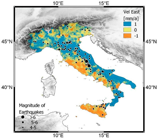 Map of the East component of the ground velocity field of the Italian Peninsula, derived from Global Navigation Satellite Systems (GNSS) and synthetic aperture radar interferometry (InSAR) during more than two decades of observation (1990–2017). The area of the Central Apennines presents major earthquakes from 1990 to present day. From the figure above, it is clear that the main seismogenic areas are linked to the boundary that divides the two blocks with opposite E–W components of velocity.