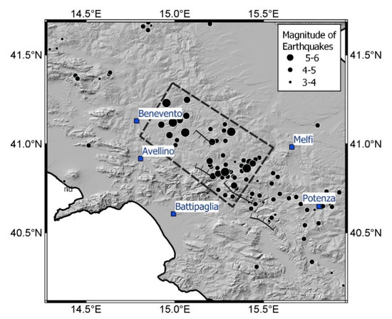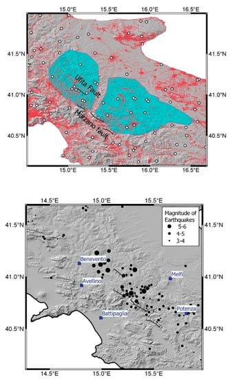 Additionally, historical seismicity can allow this—somehow unexpected—statement, given the time intervals between Irpinian earthquakes. “Irpinia” is a historical–geographical area of southern Italy, located in the Campania region, approximately corresponding to the territory of the current province of Avellino, which in turn, largely recalls the historic province of Principato Ultra of the Kingdom of Naples.