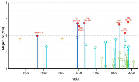 The most important historical seismic events are placed in the hanging wall of the Monte Marzano fault system [22]. If we take a polygon with vertices at the coordinate points 41.314° N, 14.971° E; 41.105° N, 14.874° E; 40.739° N, 15.352° E; 41.056° N, 15.574° E (depicted in dark red in Figure 6 (bottom)), corresponding to the Apennine seismic belt site of the major historical and instrumental seismicity, the parametric catalog of Italian earthquakes CPTI15 [26] reports about twenty earthquakes with magnitude Mw ≥ 5.0, starting from the year 1000 (see Table 1). Of these, seven have a Mw between 6.0 and 6.8. It must be said that the catalog can be considered complete, for the strongest events (Mw ≥ 6.0) only for the last 400 years, namely from 1620 up to today [27]. From the diagram in Figure 6 (top), it can be seen that until the end of the 17th century, the seismic history of the Irpinia sector is largely incomplete and poorly documented. This, obviously, is not because there were no earthquakes at all, but because only little and partial historical information about that area for those ancient periods exists today. Only a couple of earthquakes are known (in 1466 and 1517) to have occurred in this period, plus two events before the year 1000, which occurred in the year 989 and 62 CE [28]; thus, outside the reference window of the historical catalog. Both these events originated from the monte Marzano Fault [29]. The earthquake of 5 December 1456 [30] was deliberately not taken into consideration in the present study, because it is a complex event that affected a very large area of southern Italy, causing damage from Puglia to Abruzzo, and whose epicenter is not well located nor defined. Probably, that earthquake was made up of several shocks that occurred in different sectors of the central–southern Apennines a few days apart, and Irpinia was only one of the several areas that were struck [28].