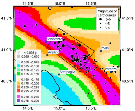 Map of seismic hazards in Irpinia (see [32]) and adjoining areas (colors in the background), derived mostly from the historical seismic records, as shown by the overlapping of strong seismic events within the map itself. The main towns of the area are drawn and labeled with dark blue squares, and the main faults (see Figure 2 (top)) are represented with black hashed lines.