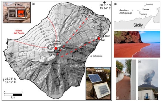 Among the three active volcanoes of the Aeolian archipelago, Stromboli, Panarea and Vulcano, the former is the most active (Figure 1). Stromboli is an open conduit volcano characterized by persistent explosive activity (Strombolian activity). During the last decades, major explosions, paroxysms, and three effusive eruptions interrupted the normal Strombolian activity. The effusive eruptions occurred in 2002–2003, 2007, and 2014; the 2002–2003 eruption affected the stability of the volcanic edifice, generating a tsunami (30 December 2002) with a run-up of 11 m, caused by a sliding mass movement along the Sciara del Fuoco to the sea. Paroxysmal explosions occurred during the 2002–2003 (5 April 2003) [] and 2007 (15 March) effusive eruptions [], and twice in 2019 (3 July and 28 August) [].