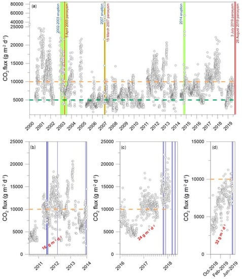 (a) Daily average CO2 fluxes at STR02 station, 2000–2019 period. The effusive eruptions of 2000, 2007, and 2014 have been inserted (vertical green bar) together with the paroxysmal events (vertical red lines) that occurred in 5 April 2003; 15 March 2007; 3 July; and 28 August 2019. Green and orange horizontal dashed lines have been plotted indicating, respectively, the baseline values and threshold value for the CO2 fluxes at STR02 (see [,,]). The insets of the higher degassing rate periods have been plotted together with the major explosions (vertical blue lines) occurred. (b) Daily average CO2 fluxes at STR02 station, June 2010–December 2013 period, with the abrupt CO2 degassing rate of 16 g m−2 d−2 . (c) Daily average CO2 fluxes at STR02 station, 2016–2018 period, with the abrupt CO2 degassing rate of 24 g m−2 d−2. (d) Daily average CO2 fluxes at STR02 station, October 2018–June 2019 period with the abrupt CO2 degassing rate of 32 g m−2 d−2.