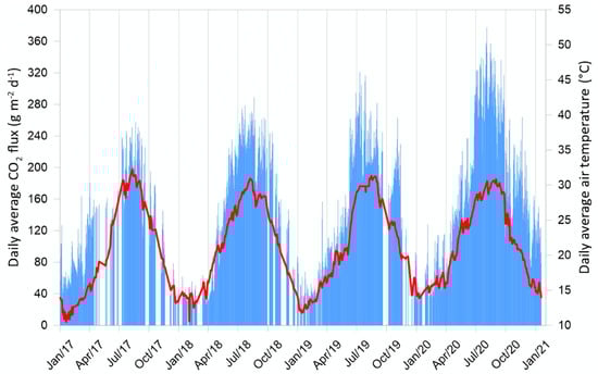 Daily average STR01 CO2 flux (blue column) vs. time (2017–2021), and STR01 daily average air temperature (red line). The cyclic behavior of CO2 fluxes and air temperature is very clear, with maximum and minimum values recorded for both parameters during the hot and cold season, respectively.