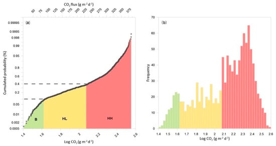 (a) Cumulative probability diagram of log CO2 flux; the data distribution highlights three main degassing families with respectively 10 (B), 30 (HL), and 60% (HH) of cumulated frequency representing respectively the biological soil respiration, hydrothermal low degassing, and hydrothermal high degassing. (b) Histogram of log CO2 flux frequency.