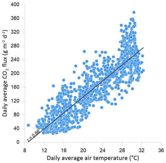 Correlation graphic between daily CO2 fluxes and air temperatures. A high correlation has been found, with R2 equal to 0.88.