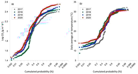 (a) Cumulated probability of CO2 fluxes calculated and plotted for each year of acquisition. The increase of the higher and lower family’s values for each year from 2017 to 2020 is visible. (b) The cumulated probability of air temperature plotted for each year shows a clear decrease of higher family’s values (hot temperature) from 2017 to 2021 and an increase of lower family’s values (cold temperature).