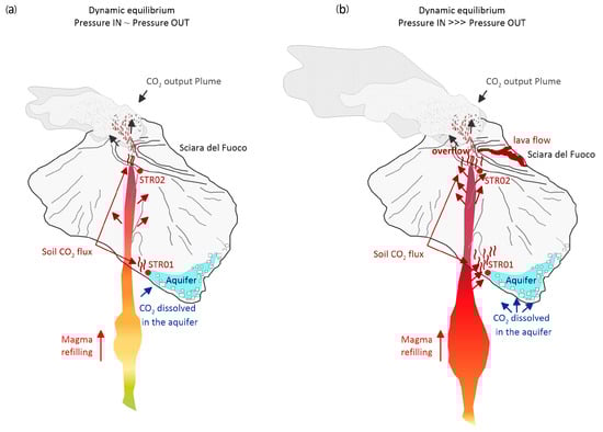 Sketch of the dynamic equilibrium model, modified from [,]. (a) Normal Strombolian activity. Volatiles exsolved from the magma standing in the deeper plumbing system interact with shallow fluids, feeding the shallow hydrothermal activity and diffuse soil degassing, whose output to the atmosphere maintains the dynamic equilibrium. (b) When the deep input considerably increases, the dynamic equilibrium is altered and the shallow system tries to restore it, increasing the outputs.