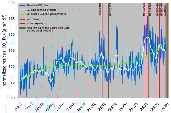 Daily average CO2 fluxes (residuals) filtered and normalized to the average temperature (25 °C) of the 2017–2021 period. The 30 day running average (white line) and the 3rd degree polynomial fit (green line) have been plotted. The main events of volcanic activity (major explosions, paroxysm, and lava flow) have been reported too.