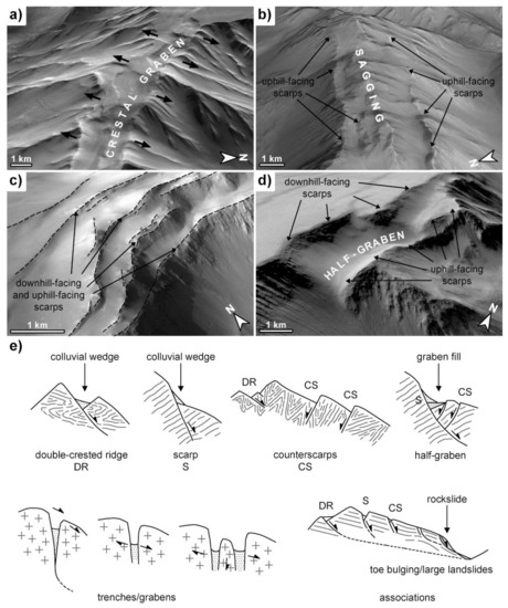 Examples of morphological features related to Deep-Seated Gravitational Slope Deformations (DSGSDs) on Mars: (a) crestal graben along the ridge at Candor-Ophir boundary; (b) sagging of crest line due to opposite systems of uphill-facing scarps along the inner ridge of Candor Chaos; (c) multiple scarps transverse to the ridge of the Melas-Candor boundary, downhill-facing along the southern margin and uphill-facing along the northern margin; (d) half-graben in the upper sector of the western slope of Hebes Chasma, defined by downhill- and uphill-facing scarps; (e) morpho-structural features characteristics of DSGSDs, redrawn after Agliardi et al. [15]. Locations of (a–d) are reported in Figure 6. All the Mars images were produced with Google Mars based on the MOLA gridded elevation data and CTX images.