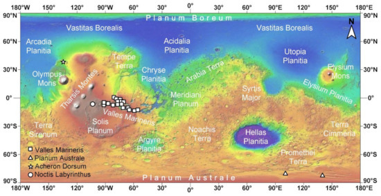 DSGSDs on Mars have been discovered recently in many areas and then described by various studies following the work of Peulvast et al. [58]. In the following sections, all the existing studies explicitly concerning the DSGSD phenomena are described with reference to the specific geographical area (Figure 3).