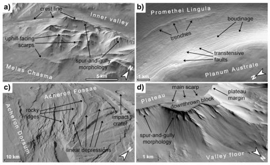 In the other regions, the importance of inherited structures was highlighted for all the described DSGSDs. The faults and the pre-existing tectonic structures show an evident control both on the trench systems of the deformational processes of Acheron Dorsum [70] and on the main scarp of the phenomenon in Noctis Labyrinthus [72]. From this point of view, characteristic DSGSDs are those of Promethei Lingula that not only reactivated pre-existing fault systems (Figure 8) but were also guided by the presence of weak layers at the base of the stratigraphic sequence [68], as demonstrated by thermal and mechanical modelling [69].