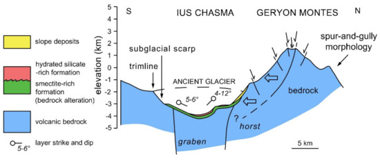 Model of development of ridge-top splitting and uphill-facing scarps along N-S cross-section in Ius Chasma; redrawn after Mège and Bourgeois [60]. The glaciation is marked by trimline, subglacial scarp, and hydrated silicate- and smectite-rich formation; the glacier retreat produces slope debuttressing and consequent triggering of large-scale gravitational deformation.