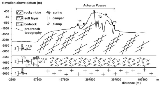 Topographic profile of the DSGSD in Acheron Dorsum along the eastern cross-section, with indication of the relative rheological schemes used for the three layers in the numerical modelling; redrawn after De Blasio and Martino [70]. As showed by numerical modelling, the large-scale gravitational deformation was guided by the rheological contrast between the rigid rocky layer and the underlying soft and viscous layer.
