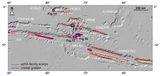 For large-scale gravitational deformation external to Valles Marineris (i.e., Acheron Dorsum, Noctis Labyrinthus, Promethei Lingula), no example of secondary landslides and large gravitational collapses has been reported. The reason for this absence could be sought in the geological settings of these areas and in the limited slope heights, although in some sectors, it is possible that landslides deposits may have been sublimated, eroded, or covered and not recognizable [67].