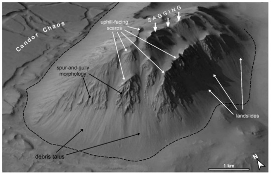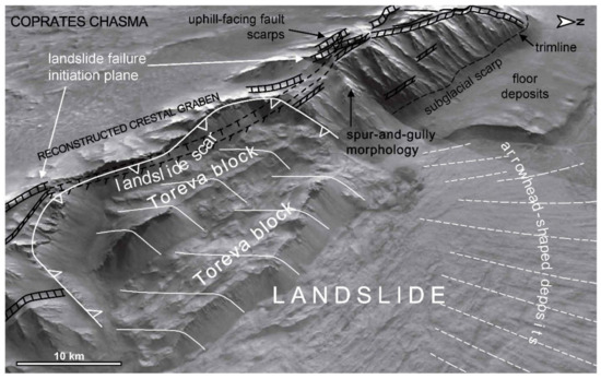 Example of large landslides related to DSGSD on the northern slope of Coprates Montes, in the central sector of Coprates Chasma; redrawn after Mège and Bourgeois [60]. The landslide scar is aligned with the uphill-facing scarps of large-scale gravitational deformation involving the internal ridge, highlighting the relation between slope failure and DSGSD. The Mars image was produced with a THEMIS image mosaic draped over a HRSC digital elevation model.