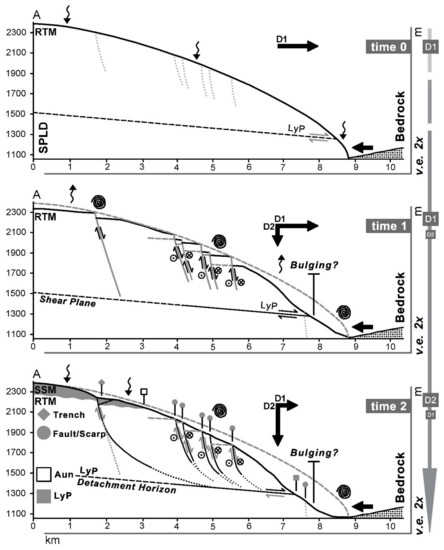 Possible geological evolution of one deformational system in Promethei Lingula, which shows the evolution of DSGSD and the role of pre-existing structures; redrawn after Guallini et al. [68]. The gravitational morpho-structures (black lines) are supposed to re-activate the pre-existent fault planes (grey lines). The LyP and bounding layers activate (and/or are activated by) the gravitational movement, and, therefore, they act as detachment levels.