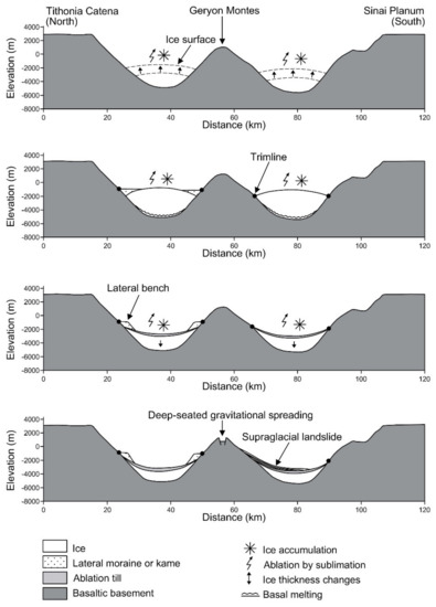 Proposed scenario for Valles Marineris glaciation along cross-section in Ius Chasma; redrawn after Gourronc et al. [61]. The sketch shows the glacial thickening and thinning, with the formation of trimlines, lateral benches, and ablation tills. As in alpine environment on Earth, the glacial retreat and the relative slope debuttressing favor the formation of DSGSD phenomena and supraglacial landslides.
