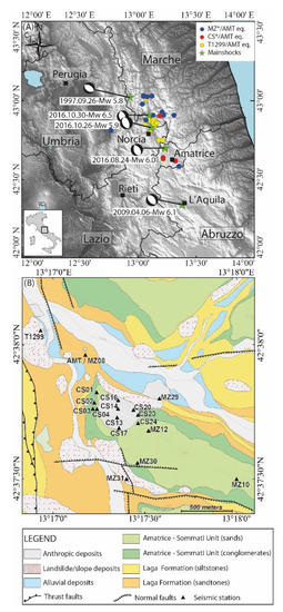 (A) Map of the study area with the strongest earthquakes that affected central Italy from 1997 to 2016 and the associated TDMT focal mechanisms (http://cnt.rm.ingv.it/tdmt, accessed on 24 April 2021; [35]); blue, red, and yellow dots represent the location of the seismic events used in this study. (B) Schematic geological map of the Amatrice downtown (modified after [27]) generated by GIS (base map source: Esri, user community, geographic information system. Coordinate system and projection: World Geodetic System 1984–Web Mercator Auxiliary Sphere); black triangle represents the position of seismic stations whose recordings are used for the analysis.