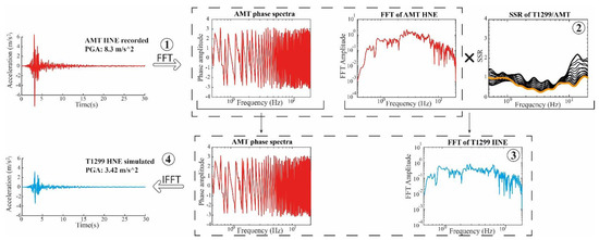 Simulation strategy proposed in this study, where numbers 1 to 4 refer to the numbered list of Section 3. Red lines represent the recorded time series and the relative phase and amplitude spectra at the reference station (AMT) for the Mw 6.5 earthquake. Number 2: orange thick line represents the standard spectral ratio (SSR) of T1299 (E–W component) with respect to AMT, thin black lines represent the 18 horizontal components of the SSR rotated every 10° and 1 vertical component. Numbers 3 and 4: blue lines represent the simulated signal at T1299 with its phase and amplitude spectra, respectively.