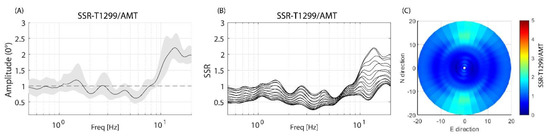 Standard spectral ratio (SSR) of T1299 with respect to AMT. (A) average SSR and the associated standard deviation along the N–S direction; (B) average SSR calculated along 18 horizontal directions every 10°; (C) polar plot showing the amplification along different azimuthal directions from 0 Hz (center of polar plot) to 20 Hz.