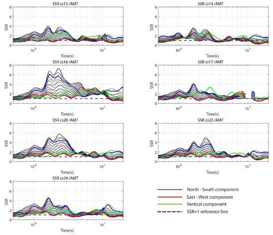We computed the SSR of the T1299, MZ, and CS stations with respect to AMT or MZ08 (they are equivalent), using different earthquakes (Table 1 and Figure 1)—for T1299 we used 15 earthquakes with magnitude between 2.6 and 5.4, recorded simultaneously at T1299 and AMT, whereas for the MZ stations we considered 12 events of magnitude range 3.1–5.9, using MZ08 as reference (Figure S2 in Supplementary Materials).