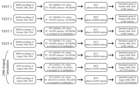 Flowchart of the simulation procedure for the four tests and the final simulation of 24 August 2016 earthquake. FFT, fast Fourier transform; IFFT, inverse fast Fourier transform; TF, transfer function (SSR).