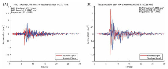 Comparison between recorded and simulated seismograms (EW component of acceleration) at MZ10 (A) and MZ28 (B) for Test 2. Red (blue) line represents the recorded (simulated) signal between 0.5–20 Hz.