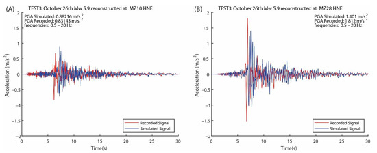 Comparison between recorded and simulated seismograms (EW component of acceleration) at MZ10 (A) and MZ28 (B) for Test 3. Red (blue) line represents the recorded (simulated) signal between 0.5–20 Hz.