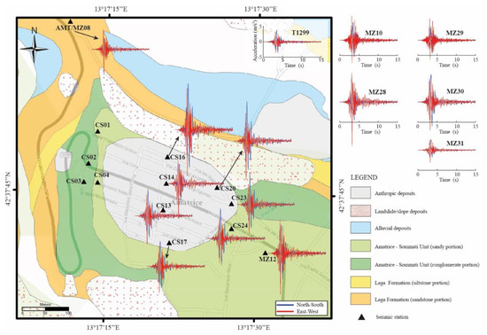 Moreover, to record the aftershock sequence and to investigate the local amplification effects for microzonation purposes, a total of 50 temporary seismic stations were installed by INGV in four municipalities, including Amatrice (MZ stations, belonging to the 3A network [40]; see also [25,31,32,33]). In this study, only six stations distributed along the NW-SE elongated Amatrice terrace were considered: the stations MZ10, MZ12, MZ28 were installed at the top of the sandy conglomeratic deposits of the Amatrice–Sommati units [27], whereas the stations MZ29, MZ30 were located in a NE–SW direction across the Amatrice hill.