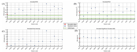 Finally, the intensity measures for the vertical component (Figure S4 in Supplementary Materials) were always larger than AMT with the exception of T1299 and MZ31, and they never exceeded the 100% of AMT for PGA and PGV. Arias intensity values, instead, were larger than AMT by about 100–350%. The significant duration of the simulated signals showed a slight variation, with a maximum increase of about 1.1 s with respect to AMT.